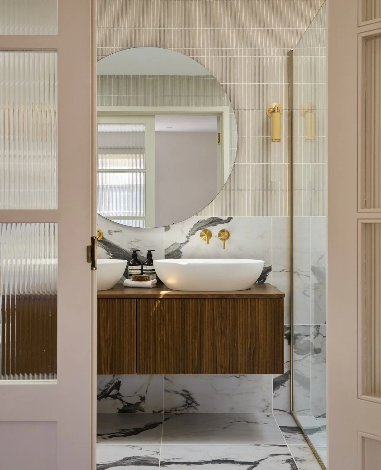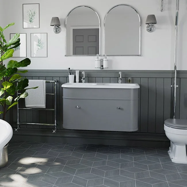 View fullsize This stylish ensuite balances a muted color palette with the organic warmth of a wall hung wood effect vanity. The design is grounded by classic chrome fixtures and sleek glass, resulting in a space that feels both contemporary and timeless.
